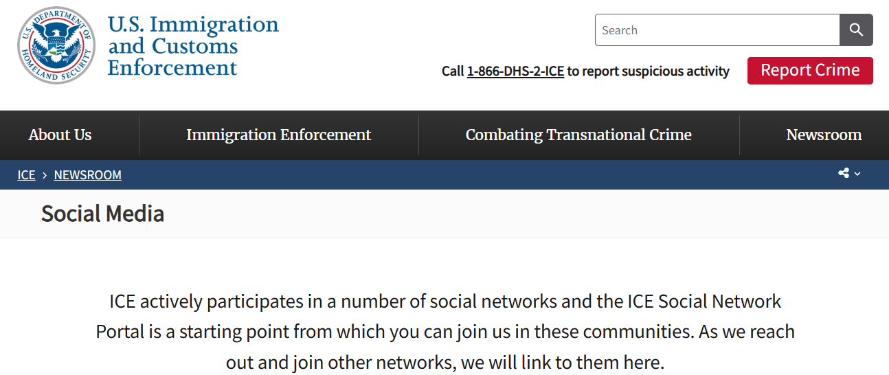 Here’s the link from the ICE website. You’ll see the two screenshots below plus a listing of affiliated social media sites.
